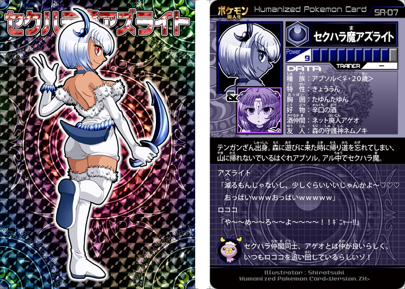 pixivのマイピクの のっぺさん に背景を作ってもらい、カード化していただきました! 神羅万象風のカードです。なので私のシリーズはシーラ万象カードになります。 私はイラスト・文章の提供のみで、背景・文字調整等はのっぺさんにやっていただきました。 あくタイプ背景は格好良すぎてヤバイです…! よく見ると円の部分がアブソルモチーフだとか。やったね! 2010.7.22 おまけのノーマル背景カード。